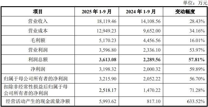 2025年1-9月,大鹏工业实现营业收入18,119.46万元,同比增长28.43%;实现净利润3,198.32万元,同比增长59.89%;实现归属于母公司所有者的净利润3,215.90万元,同比增长56.70%;实现扣除非经常性损益后归属于母公司所有者的净利润2,518.17万元,同比增长71.28%;经营活动产生的现金流量净额为5,993.62万元,同比增长633.52%。
