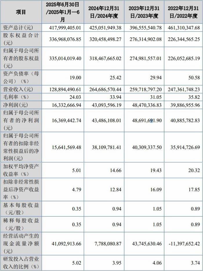 2022年、2023年、2024年和2025年1月-6月,大鹏工业营业收入分别为24,736.17万元、25,971.88万元、26,468.66万元和12,889.45万元,净利润分别为3,988.70万元、4,847.03万元、4,309.36万元和1,633.27万元,归属于母公司所有者的净利润分别为4,088.58万元、4,869.17万元、4,348.61万元和1,636.94万元,扣除非经常性损益后归属于母公司股东的净利润分别为3,591.47万元、4,030.93万元、3,810.98万元和1,564.16万元。