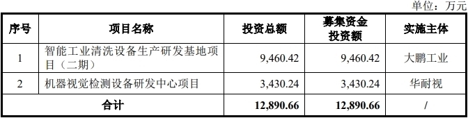 大鹏工业本次发行募集资金总额为人民币13,500.00万元,扣除发行费用后,募集资金净额为11,953.76万元。大鹏工业本次募集资金净额较原拟募集资金多936.90万元。根据大鹏工业于2025年11月3日披露的招股说明书,该公司拟募集资金12,890.66万元,分别用于智能工业清洗设备生产研发基地项目(二期)、机器视觉检测设备研发中心项目。