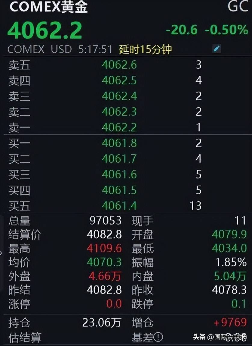 期货市场同样表现低迷。COMEX黄金期货日内出现跳水行情,截至记者发稿,COMEX黄金期货日内跌0.5%,报4062.2美元/盎司,盘中最低触及4034美元/盎司。