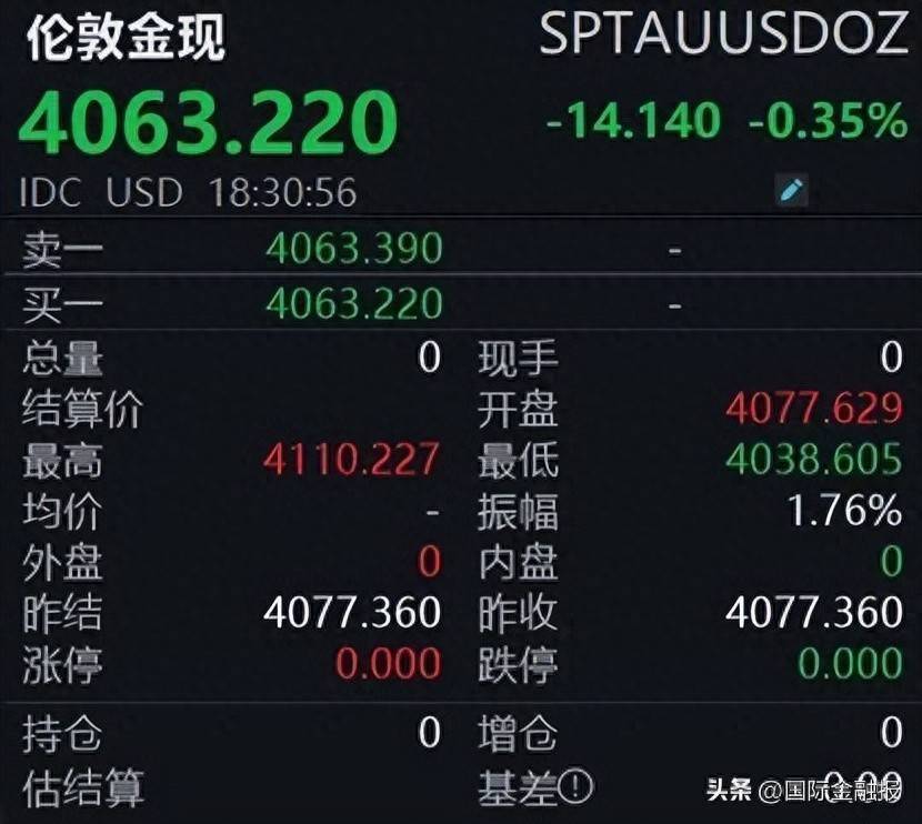 11月20日,国际金价呈现明显下行趋势。截至记者发稿,伦敦金现下跌0.35%,报4066.22美元/盎司,盘中最低跌破4038.605美元/盎司。
